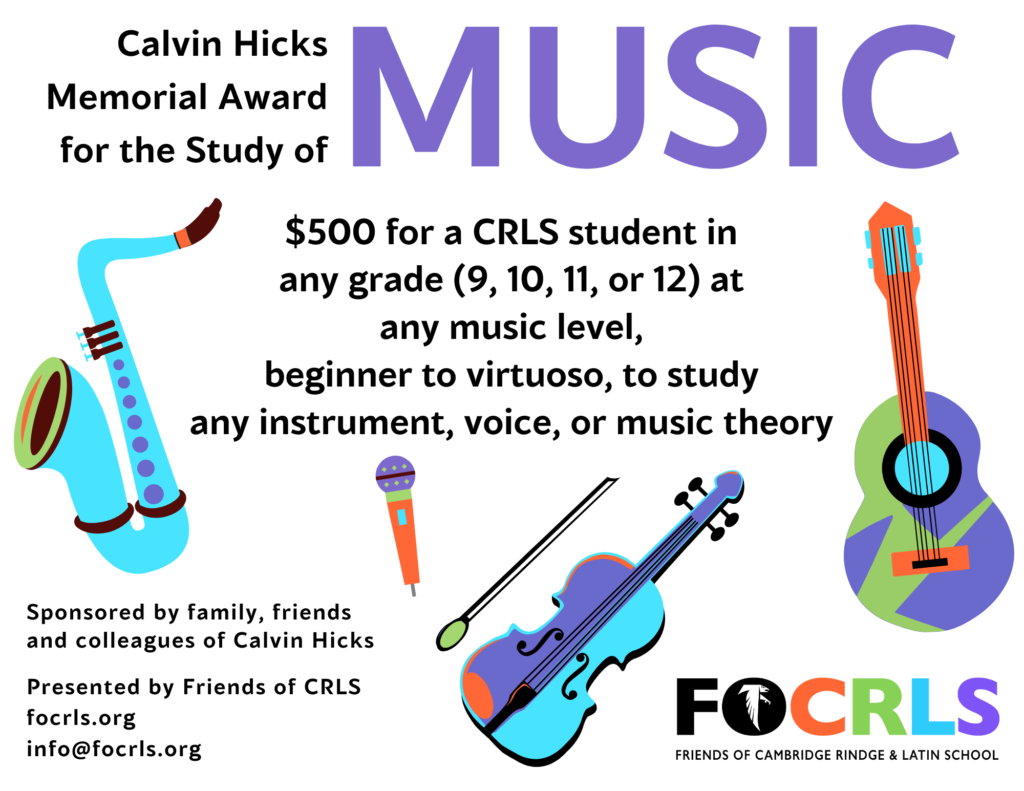 CRLS students in grades 9, 10, 11, and 12 are eligible. Requirements: a love of music, a commitment to learning, and financial need. Awardee may be at any level of music, from beginner to virtuoso. Awardee may study any instrument, voice, or music theory.