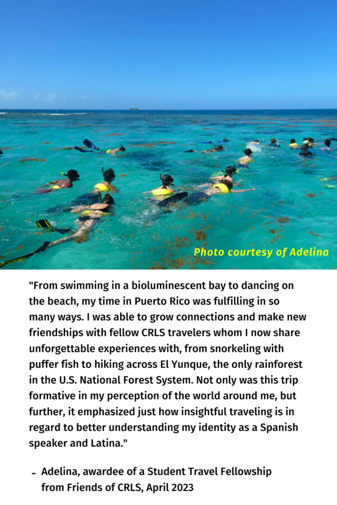 Nine Student Travel Fellowships totaling $19,940 for the CRLS trip in April to Puerto Rico. Thanks to our donors, we were able to provide resources to students who were earning, raising, and saving funds for their adventures. By being able to participate in this trip, they broadened their horizons, became immersed in culture, explored the environment, experienced the tropics, built their confidence, and created memories.