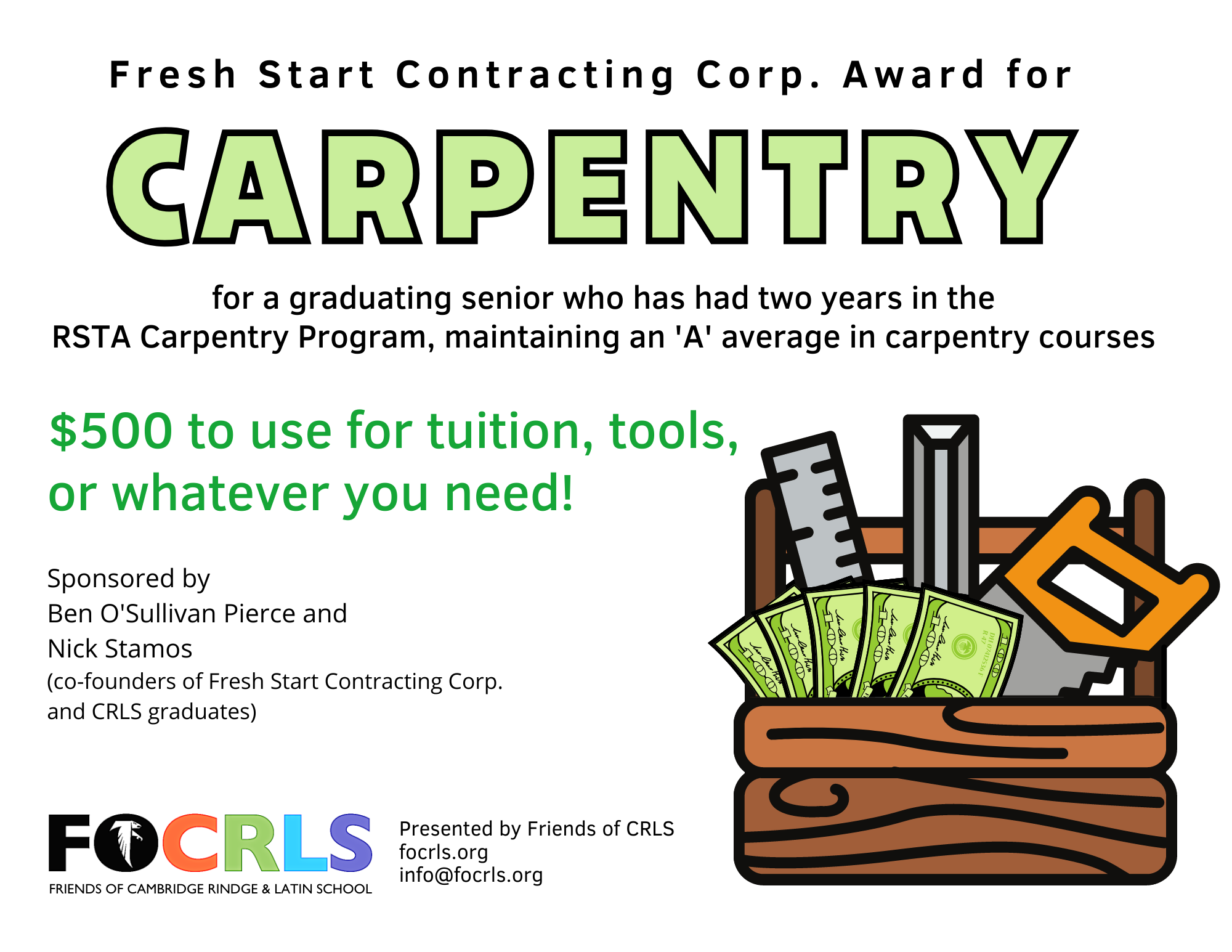 The awardee may have any post-CRLS plan, any career goals, and may use the funds for any purpose.