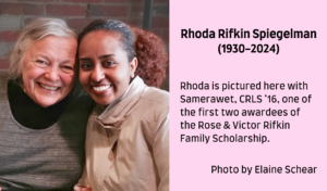 This scholarship, donations to which are tax-deductible, was established by the friends and family of Rose and Victor Rifkin, who were the parents of Rhoda Spiegelman and Doris Tanklow; the grandparents of Ellen Turcotte, Donna Spiegelman, Karen Tanklow and Debra Tanklow; and the great-grandparents of Nessarose Schear, Ariela Schear, and Adam Smokler.
