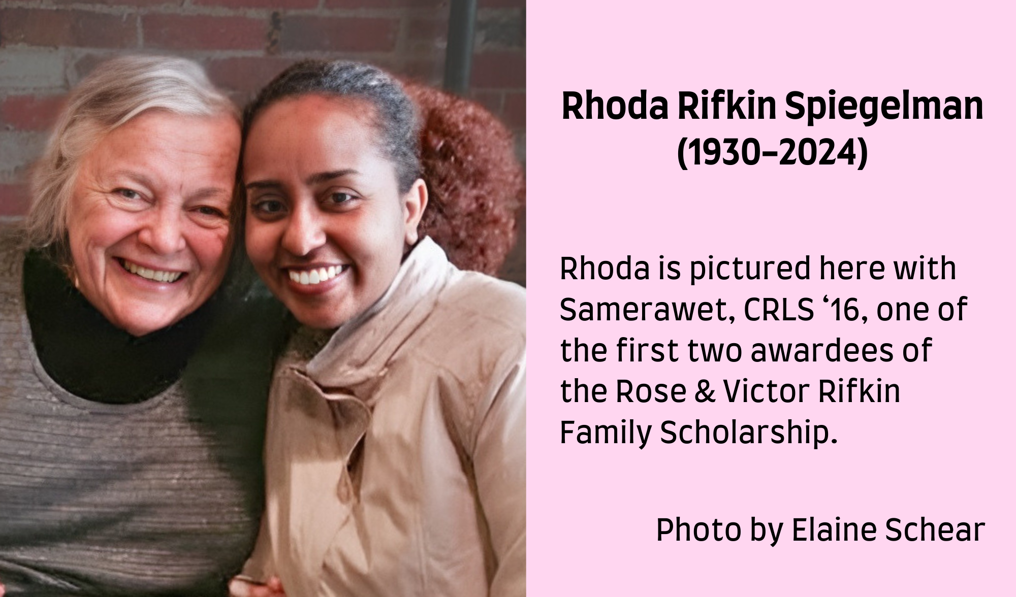 The Rose and Victor Rifkin Family Scholarship was established by the friends and family of Rose and Victor Rifkin in honor of their second daughter Rhoda — on the happy occasion of her 85th birthday — and in memory of their first daughter Doris. The scholarship supports the college education of recent alumni from Cambridge Rindge and Latin School who are first generation and/or low income students who are choosing to pursue college education as their path to attaining the American Dream, just as Rose and Victor Rifkin’s daughters, Doris and Rhoda, did.